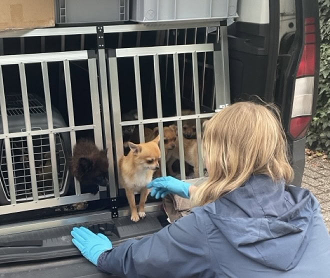 Aus einem Haushalt sollten eigentlich „nur“ vier Papageienvögel zu uns kommen, doch als Simon vor Ort ankam, liefen ihm knapp 30 kleine Hunde vor die Füße.