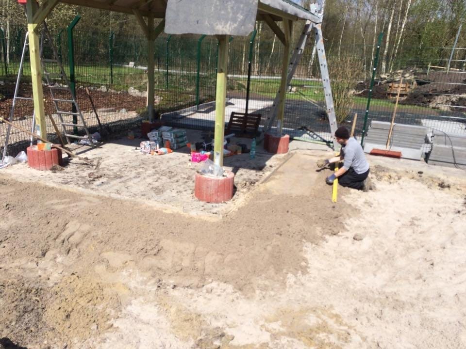Nach dem wir ein tolles großes Loch gebuddelt haben, füllen wir es wieder mit unmengen Sand auf. Gleichzeitig setzten wir Kantsteine um die Wege. Ein kleines unterirdisches Kiesbeet soll für trockene Pfoten sorgen.