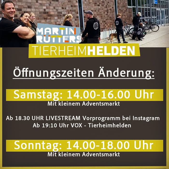 Aufgrund der Ausstrahlung der Folge „Martin Rütters Tierheimhelden“ auf VOX, die sich das Team zusammen mit den TierretterPaten und den Ehrenamtlichen im Amadeus angucken wird, schließt das Tierheim an diesem Advents-Samstag bereits um 16 Uhr! Bis dahin gibt es aber noch Waffeln und Co. Ab ca. 18:25 Uhr könnt ihr dann im Livestream auf Instagram […]