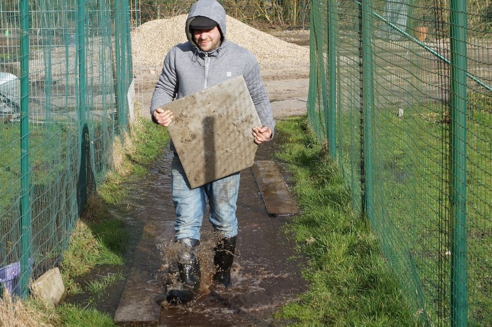 Durch Pfützen und Schlammlöcher wurden Platten und Feldsteine getragen – 40qm Grasnaben wurden ausgebuddelt und ein Hochbeet im Besucherbereich angelegt. Naja, zumindest wurde damit angefangen. Für dieses Wetter war dies aber ein sehr erfolgreicher Tag!