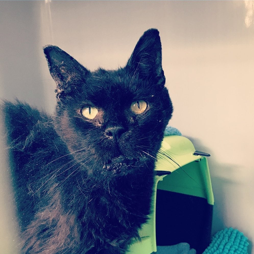 Fundkater Kalle wurde mit einer Lebendfalle gefangen und kam gut unter einem Laken versteckt im Tierheim an. Als das Laken gelüftet wurde, um zu sehen was da genau eingefangen wurde und um Kalle umzusetzen in eine Quarantänebox, hatte niemand erwartet, das zu erleben: Kalle ist stark abgemagert, hat schlimm verfilztes, stark riechendes Fell, er hat keine Stimme mehr, rotzt tüchtig und jeder Atemzug rasselt vom Schnupfem, seine Ohren sind zerfleddert und vermutlich entzündet, seine Krallen schief gewachsen. Und trotzdem ist Kalle voller Liebe für uns Tierpfleger und will am liebsten die ganze Zeit kuscheln. Wir hoffen, dass wir dem alten Kater helfen können.