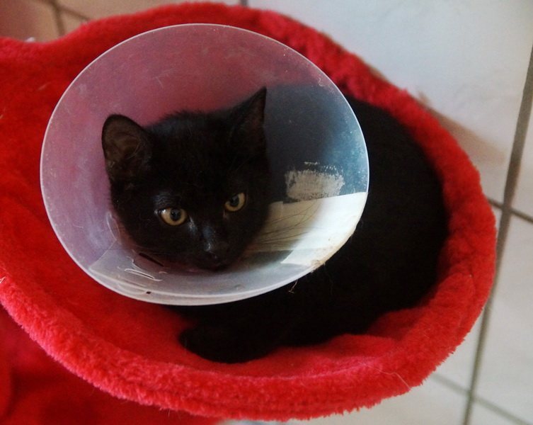Der kleine Hendrikus wurde beim Tierarzt wegen eines Darmvorfalls behandelt. Damit er an die empfindliche Stelle nicht herankommt, muss er einen Kragen tragen und wird jeden Tag mit einem pflanzlichen Mittel zur besseren Abheilung eingesprüht. Findet er zwar doof, aber da muss er leider durch – und zur Belohnung wird immer kurz gekuschelt. ;-)