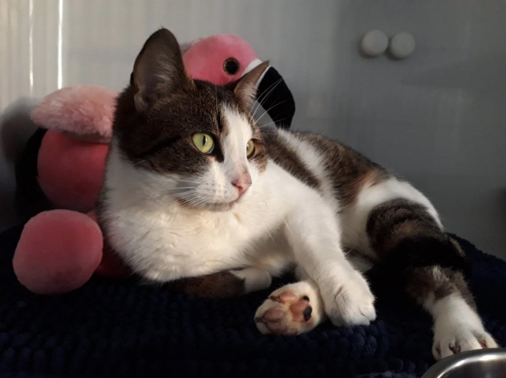 Katze Nomy ist durch ihre kahlen Ohren aufgefallen und wurde direkt unter die Lupe genommen, genauer gesagt mit einer speziellen Lampe angeleuchtet, die Hautpilze sichtbar macht. Sie leuchtet zwar, aber um ganz sicher zu sein, muss der Tierarzt noch eine Kultur anlegen. Damit sie keine anderen Katzen anstecken kann, sitzt sie in einem Quarantänezimmer und wird behandelt, bis sie wieder gesund und nicht mehr infektiös ist.