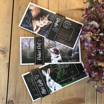 Unsere hübschen Geschenkkarten gibt es in drei verschiedenen Tiermotiven und drei Banderolen, um die richtigen Worte für den richtigen Anlass zu finden. Außerdem ist Platz für eine persönliche Notiz von euch für den Beschenkten.