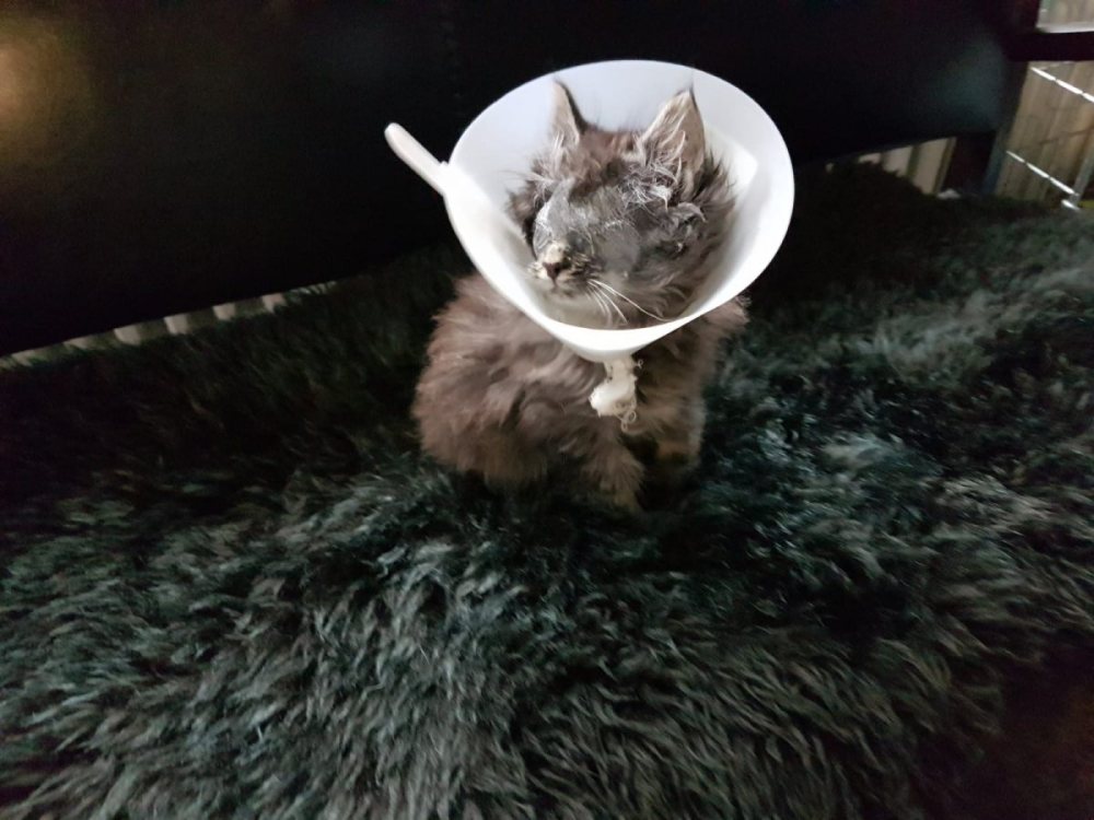 Der kleine Kater Augustin kam mit fürchterlich entzündeten Augen zu uns. Ein Auge war ganz geschwollen und hervorgetreten, das andere schon ausgelaufen. Es blieb keine andere Wahl, als beide Augen operativ zu entfernen. Da Augustin schon lange blind gewesen sein musste, war die Operation eine große Erleichterung für ihn. Nun tut ihm nichts mehr weh und damit, dass er nicht sehen kann, kommt der kleine Knirps wunderbar zurecht.