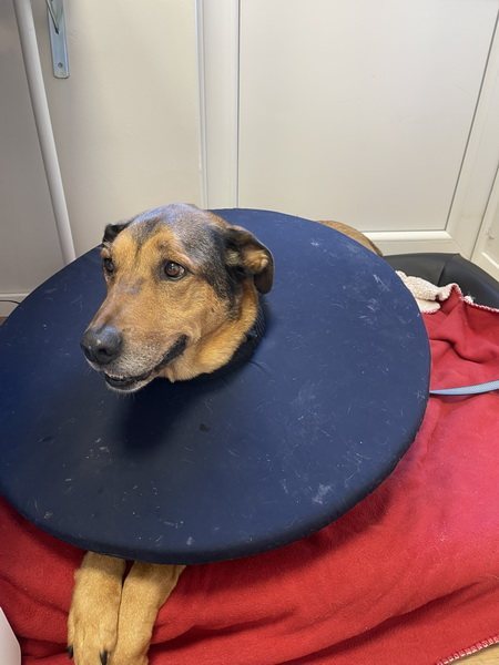 Die OP ist vorbei, Bantu ist wieder bei uns und ganz KO. Er ist noch nicht zu 100 % wach, aber es geht ihm gut. Er wurde an beiden vorder Beinen operiert, weshalb er auch einen Kragen tragen muss. Jetzt muss nur noch alles schnell verheilen und Bantu ist wieder ganz der Alte.