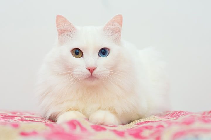 Bella ist eine türkisch Angora Katze, eine Rasse, die für ihr auffälliges, seidiges Fell und ihre elegante Erscheinung bekannt ist.