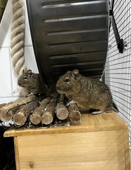 Diego und seine Freunde sind zu uns ins Tierheim gekommen, weil ihre Halter umziehen mussten und unsere vier Fellnasen leider nicht mitkonnten. Bei uns zeigte sich schnell, dass Diego nicht richtig gucken kann. Bei genaueren Untersuchungen stellte sich heraus, dass einer in der Viererbande leider Diabetes hat, eine Spätfolge von Diabetes bei Degus ist, dass sich das Auge eintrübt und das Tier leider erblindet. Das ist hier tatsächlich der Fall gewesen. Degus sind tatsächlich sehr anfällig für Diabetes, wenn die Fütterung falsch ist. Die kleinen Nager vertragen frisches Obst und Gemüse leider gar nicht, weil ihr Stoffwechsel viel zu gut ist.