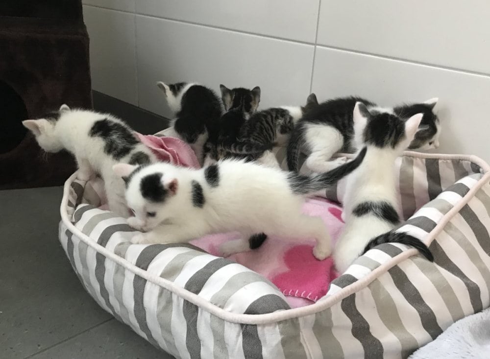 Kleine Katzen, sieben an der Zahl, sind zu uns gekommen. Die kleinen Wesen sind sehr neugierig und gut beisammen, sodass sie in eine schöne, kuschlige Stube einziehen können. Ihre erste Mahlzeit nehmen sie mit viel Hingabe zu sich und haben am Ende wahrscheinlich mehr Futter im Fell als im Magen … ;-) Zum Glück dürfen die sieben Flauschbälle zu unserer Oma Erika, um dort groß und stark zu werden.