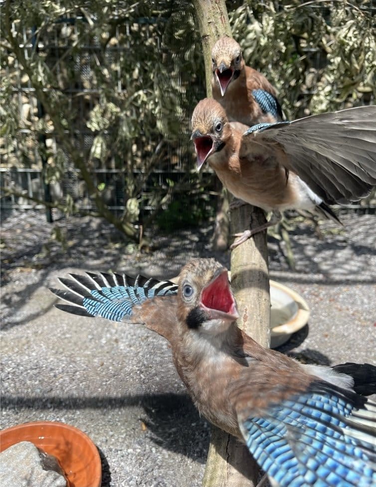 Tierpfleger Benny war ganz aus dem Häuschen, als uns drei junge Eichelhäher gebracht wurden. Er erklärte sich direkt bereit, Ersatzpapa zu sein. Die drei sehr hübschen Vögel sitzen mittlerweile tagsüber in einer unserer Volieren und werden regelmäßig mit Liebe gefüttert, über Nacht dürfen sie mit zu Anne. Wir hoffen, alle drei Auswildern zu können, wenn sie groß genug sind.