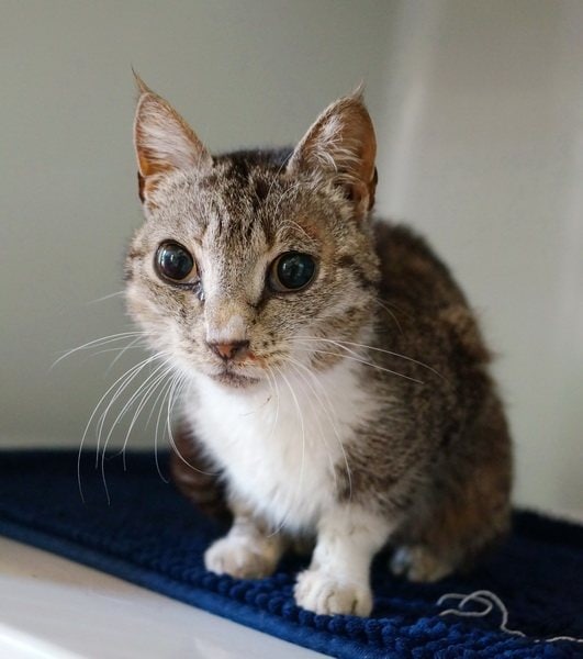 Fundkatze Dorothea wurde mit einem schlimmen Schnupfen abgegeben. Sie atmet sehr schwer und röchelig, ist klapperdürr, hat struppiges Fell und teilweise krustige Hautstellen. Sie scheint zudem völlig blind zu sein. Aber obwohl es ihr so schlecht geht, ist sie eine ganz freundliche und liebe Katze und versucht beim ausgiebigen Kuscheln sogar zu Schnurren. Sie wird in der Krankenstation nun erstmal gepäppelt, bekommt Medikamente und darf dampfbaden, um ihr die Atmung zu erleichtern.