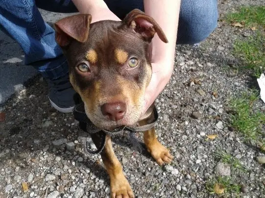 Und dann kam Anfang 2015 ein Anruf und Frauchen schaute mich dabei ganz besorgt und nachdenklich an und ich hörte nur „Ja, ich hole ihn daraus, aber ich muss erst testen, ob er mit Menschen und Maggy zurechtkommt. Zeigt er Aggressionen gegen mich oder Maggy müssen wir ihn woanders unterbringen.“ Ach du S******, was hat Frauchen da vor?! Kurz danach kam mein persönlicher Gassigeher (der kommt immer, wenn Frauchen über Tag zur Arbeit musste) und Frauchen verschwand. Stunden später tauchte sie wieder auf und roch ganz komisch, eine Mischung aus Hund und Tierarzt. Ohje, muss ich schon wieder zum Arzt? Ich glaube schon, denn Frauchen legte mir Halsband und Geschirr um und wir gingen raus. Frauchen war irgendwie nervös und mein Gassigeher war auch noch da, obwohl der immer sofort geht, wenn Frauchen wieder da ist. Irgendwas stimmte da nicht. Und dann sah ich ihn. Er war groß, schwarz, ein Rüde und genau so ein Pitbull wie ich! Einfach perfekt! Ich freute mich und schaute Frauchen an „Ist der etwa für mich? Bleibt der bei uns?“ Frauchen ging zum Auto und holte diesen Traum von Hund raus und ich hab mich fast nicht eingekriegt vor Freude. Mein Gassigeher konnte mich kaum halten und da war ja auch noch so ein doofer Zaun dazwischen. Auf dem zweiten Blick zeigte sich, dass der Traum von Hund gar nicht gut aussah und er stank ganz fürchterlich und er hatte ganz große Angst. Sowas hatte ich noch nie gesehen, was ist ihm nur passiert? Und dann hatte er mich entdeckt – „oh, ob der mich auch mag? Der ist komisch, eine Mischung aus Angst und Aggression?!“ Ich schmiss mich lieber eben auf den Boden mhhhh lieber mit Abstand zum Zaun und stellte mich vor. Skeptisch näherte er sich dem Zaun und ich erfuhr, dass er keinen Namen hat, 11 Monate alt ist und sehr viel Angst hatte und diese Welt gar nicht kannte.