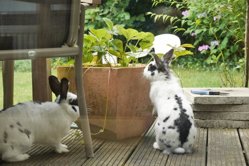 Die zwei Kaninchen sind gut bei uns angekommen und pflegen nun regelmäßig unseren Garten. Sie mähen den Rasen, Düngen und halten die essbaren Büsche und Blumen bis zu einer Höhe von 40cm kurz. Dazu lockern sie den Boden auf, indem Sie versuchen tiefe Löcher zu buddeln, die wir dann wieder zuschütten müssen. Abends lassen sie sich aber sehr willig mit Möhren oder anderen Leckereien in den Stall locken und dann auch streicheln…Zumindest solange gefressen wird.