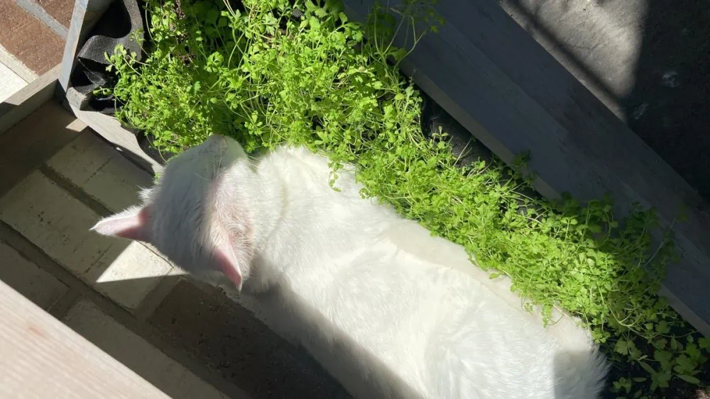 Mir geht es prächtig, ich darf jetzt sogar raus auf die Terrasse. Da liege ich am liebsten in Muttis-Hochbeet. Am Anfang fand sie das nicht so klasse, jetzt hat sie sich glaube ich damit abgefunden, dass ihre Kresse platt ist.
