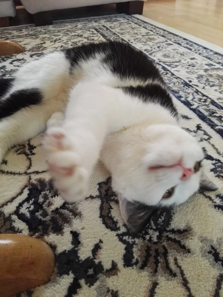 Naja, der Start war nicht so einfach. Es kamen eines Tages zwei große Vierbeiner zu besuch in mein Zimmer wo ich mit meinen Geschwistern und Freunden gelebt habe. Die anderen waren viel neugieriger als ich, und auch zutraulicher. Aber irgendwie ging es diesmal trotzdem nur um mich. Und oben drauf versuchten die dann auch noch, mich einzufangen! Ich weiss nur noch, dass Ich von einem grossen Netz aufgefischt und in eine grosse Kiste gesteckt wurde, dann war alles dunkel, wackelig und laut, und dann wurde die Kiste wieder aufgemacht. Wenigstens hatten die Riesen so viel Anstand, mich jetzt ein wenig in Ruhe zu lassen! Und es dauerte nicht lange, da gab es die nächste Überraschung: da wohnt ja noch ’ne Katze!! Groß, türkise Augen zum verlieben, ein dichtes, braunes Fell – was will Mann mehr?! Nach zwei Tagen traute Ich mich heraus aus meinem Zimmer und versuchte, mich mit meiner neuen Freundin bekannt zu machen, aber die war erstmal gar nicht so begeistert. Vielleicht war es der Altersunterschied…? Aber so langsam habe Ich sie überzeugt und sie hat mir in einer Woche schon allerlei beigebracht. Zum Beispiel wie das hier mit dem Fressen so läuft, paar Manieren, und dass die Riesen gar nicht so doof sind. Jetzt kann ich gar nicht genug von meiner Riesenmama bekommen; ich folge ihr auf Schritt und Tritt und kuschel mich am liebsten auf Ihrem Arm an die Schulter.