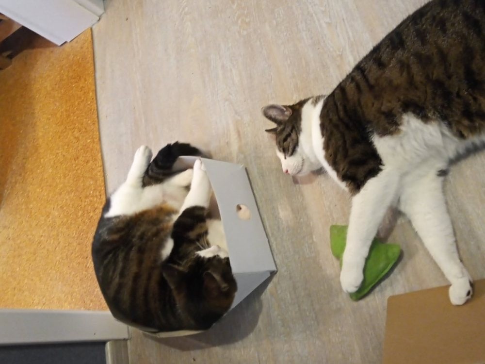 Vor erst zehn Tagen habe ich dieses Geschwisterpaar aufgenommen. Während sie die ersten Tage kaum das Schlafzimmer verlassen haben, laufen sie mir jetzt schon öfter nach und verlangen nach Aufmerksamkeit (oder Futter ð). Besonders begeistert sind beide an jedem Home Office Tag und dann ganz nah dabei.