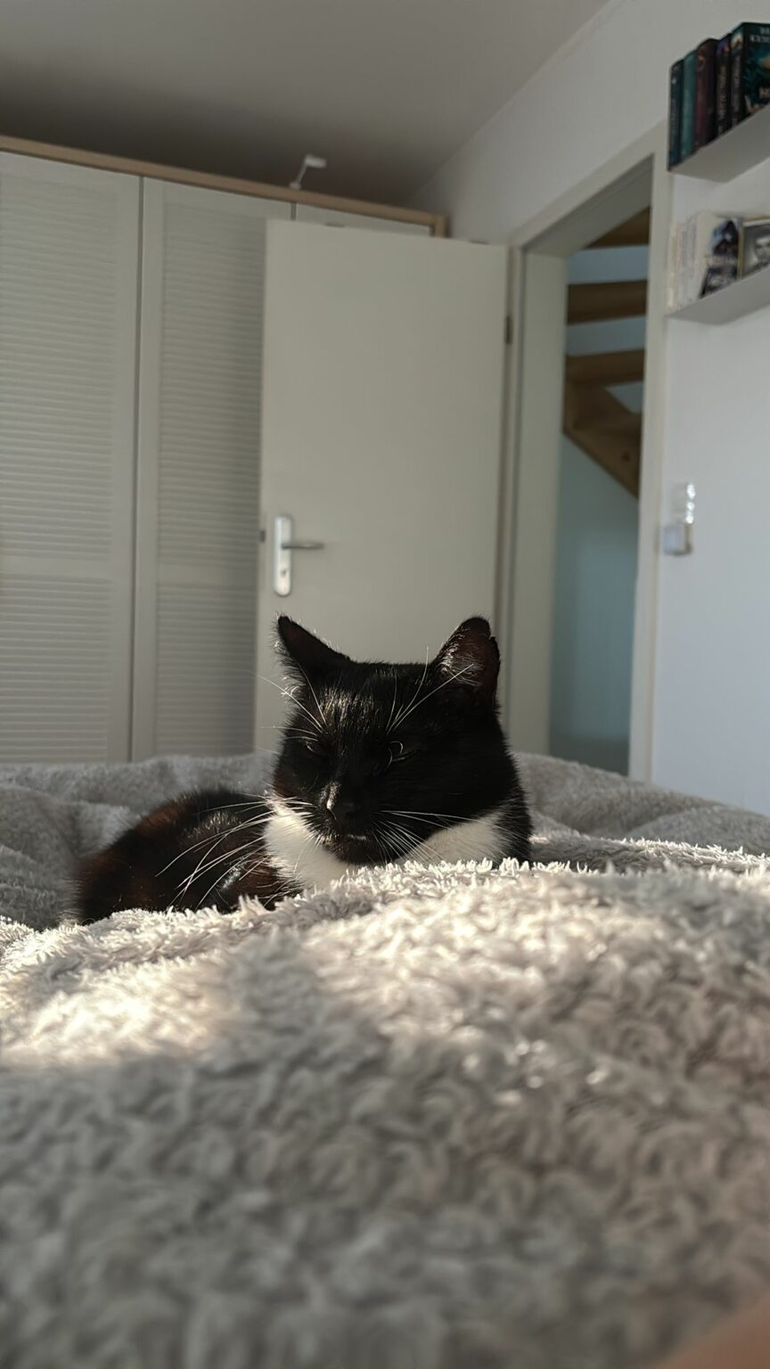 Im Tierheim war ich eine sehr scheue Katze, meine neue Familie konnte mich nicht anfassen und streicheln weil ich mich verkrochen habe. Wie ihr seht, bin ich Zuhause aber ganz schön aufgeblüht und es gibt nichts Schöneres.