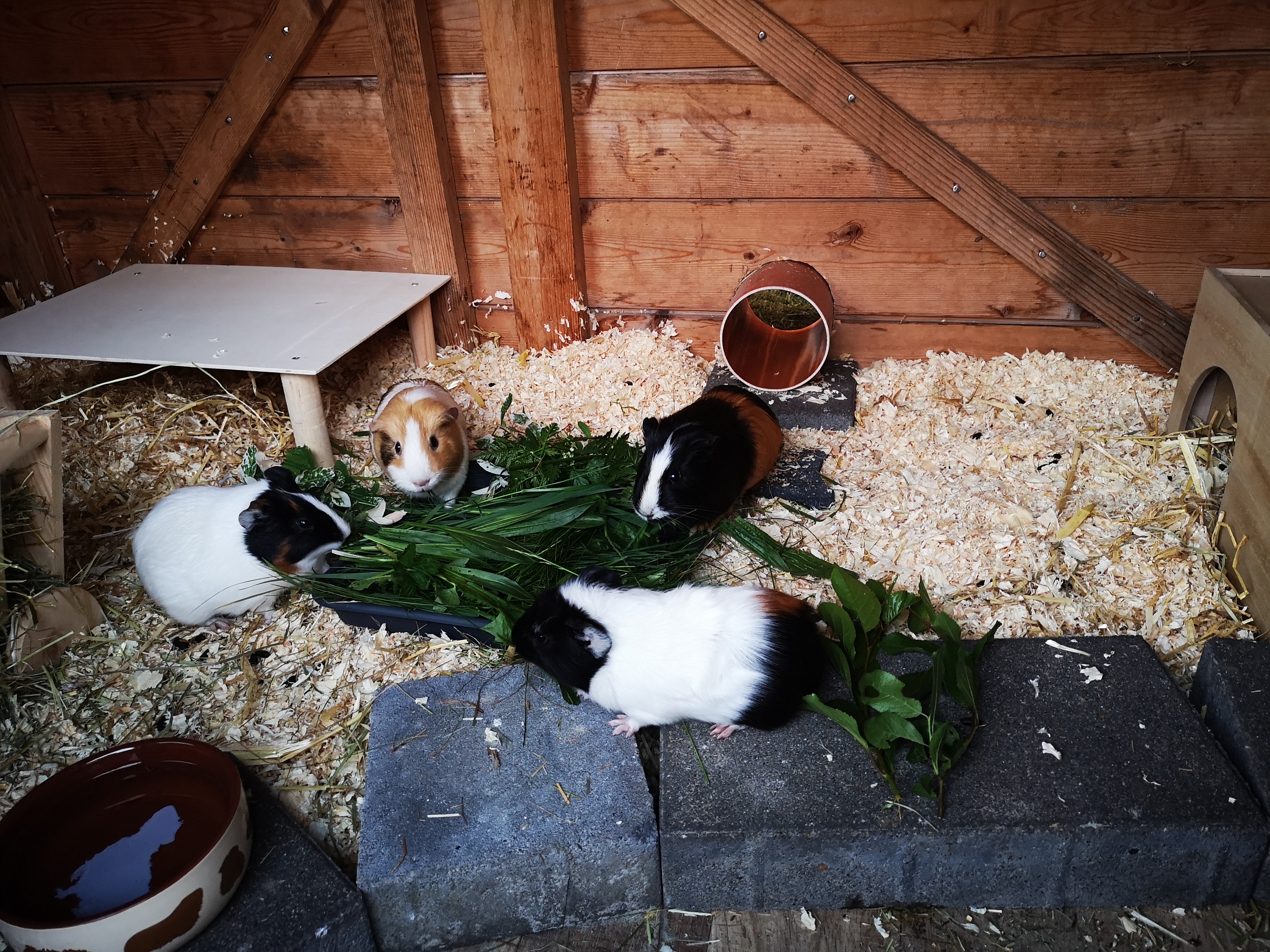 Seit einer Woche wohnen die vier Damen jetzt bei uns. Sie haben sich schnell eingelebt und scheinen sich pudelwohl zu fühlen. Am liebsten fressen und chillen sie, aber sie rennen und springen auch oft übermütig durch ihr Gehege.
