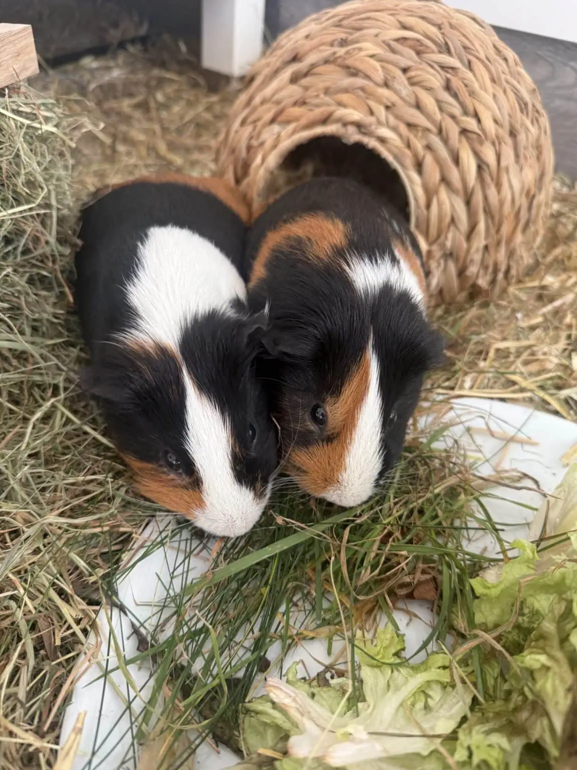 Hi, wir sind Bruno und Pepper, zwei kastrierte Schweineherren. Unsere Familie hat uns Ende Dezember 2025 aus dem Tierheim Oldenburg adoptiert. Da hießen wir noch Uwe und Uli. Die Mama und der Papa der Familie mochten diese Namen eigentlich sehr gern (Uwe Seeler und Uli Höneß), aber unsere eigentliche Mama, die Tochter der Familie, hat uns nun Bruno und Pepper getauft. Damit sind wir auch zufrieden ;) Auch wenn es im Tierheim OL eigentlich gar nicht so übel war, so freuen wir uns, dass wir inzwischen eine eigene Familie haben. Wir haben uns ruckzuck in unserem neuen Heim eingelebt und führen jetzt ein glückliches Schweineleben in einem großen gemütlichen Gehege mit vielen Versteckmöglichkeiten und täglich frischem Grünzeugs und Heu. Nun warten wir, dass endlich draußen wieder frisches Grün wächst, dann sind wir rundum glücklich. Ab und zu dürfen wir auch durch die Bude flitzen und machen kleine Ausflüge. Das fanden wir anfangs echt gruselig, aber dann sind wir doch neugierig geworden, was es alles zu entdecken gibt. Im Sommer sollen wir wohl hin und wieder auch in ein sicheres Gehege nach draußen und im frischen Gras spielen, haben wir gehört … da sind wir sehr gespannt, was uns da erwartet. Wir wissen nun auch, dass die Hände, die da immer mal ins Gehege gesteckt werden, uns nichts Böses wollen und immer lecker Futter bringen, das finden wir total toll.