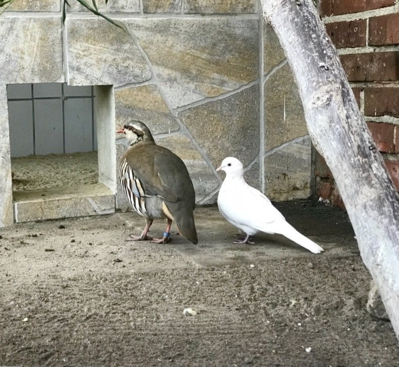 Die große Liebe haben unser Rothuhn Rotraud und die Lachtaube Lilly gefunden: nachdem Rotraud als Fundtier mit in die Voliere gezogen ist, hat sich Lilly an ihren Rockzipfel gehängt und nun machen die beiden alles zusammen: fressen, putzen, gucken wer so guckt. Nur auf hohe Äste kann Rotraud sich nicht mitsetzen, den Ausguckjob übernimmt Lilly. :-)