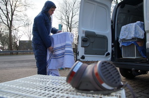 Mit Gasmasken und Schutzanzügen sehen wir durch Schutzbrillen Wohnungen, in denen eigentlich kein Mensch mehr Leben kann, Wohnungen wie in einem Alptraum. Amoniakausdünstungen, die trotz Maske nicht auszuhalten sind, Hitze ausgehend von den Bergen an Müll, Exkrementen und Urin, die Wände schwarz vor Fliegenlarven. Und dann, mit Tränen in den Augen, dem Geräusch des Ein- und Ausatmens der Gasmaske, muss man funktionieren. Man will das alles nicht wahrhaben und es eigentlich nicht sehen müssen. Box für Box trägt man die verängstigten und verwahrlosten Katzen nach draußen, unter Bergen von Müll und Kot hört man Katzenbabys nach ihrem Muttertier schreien, drei sind noch am Leben, eines ist tot – man zählt sonst nicht mit. Verdurstete Tiere werden aus gestapelten Kaninchenkäfigen geholt, immer wieder versucht man den Überblick zu behalten: „rechts drei , links bei dir, unterm Tisch, rot-getigert….“ Nach einer Stunde geht man hinaus, in der Hoffnung, dass man in diesem undurchsichtigen, surrealen Moment alle Tiere eingefangen hat.