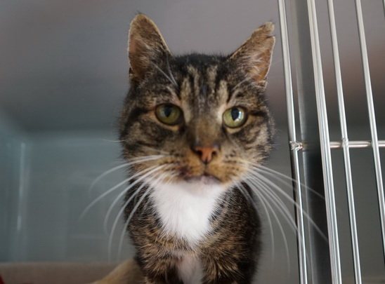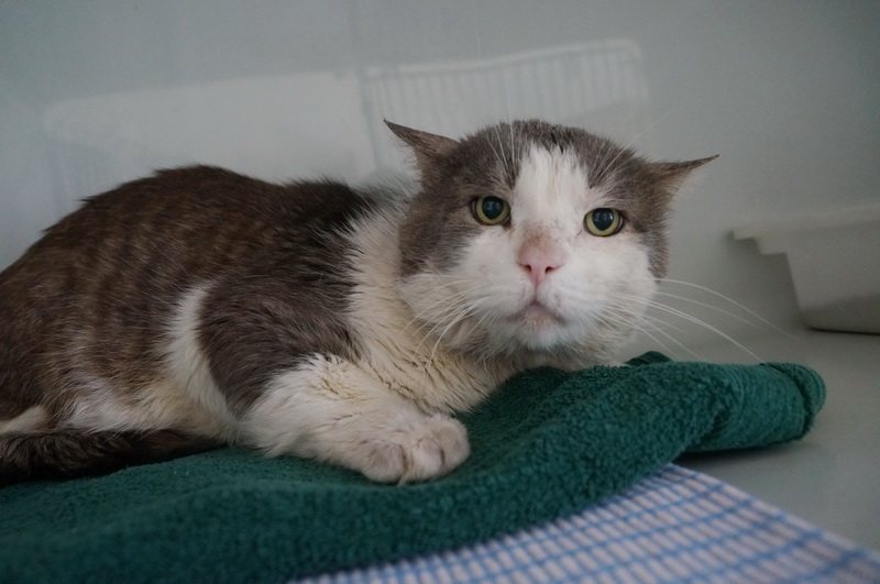 Oskar ist ein ganz lieber dicker Kater, der wohl schön längere Zeit draußen gelebt hat. Er hat großflächige kahle Stellen im Halsbereich, deren Ursache vom Tierarzt abgeklärt werden muss.