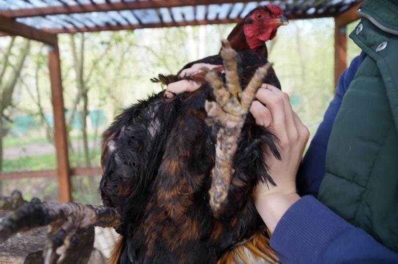 Der Hahn wurde mit anderen Tieren zusammen einfach von seinen Besitzern zurück gelassen… Seine Beine sehen heute schon viel besser aus, aber bis zur vollständigen Heilung wird noch etwas Zeit vergehen. Jeden Tag werden sie mit einer Salbe eingecremt.