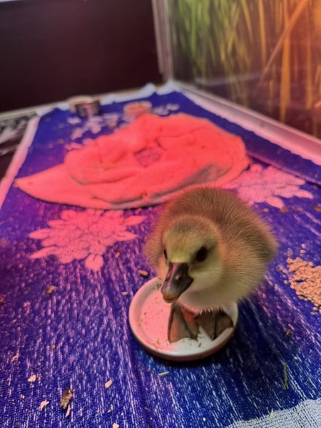 Dora und Flora wurden am Straßenrand gefunden, von ihren Elterntieren war weit und breit keine Spur. Da dies kein normales Verhalten von Gänsen ist, haben die Finder die beiden kurzerhand zu uns gebracht. Hier sitzen sie jetzt unter einer Wärmelampe und werden gepäppelt, sodass wir sie, wenn es soweit ist, wieder auswildern können.