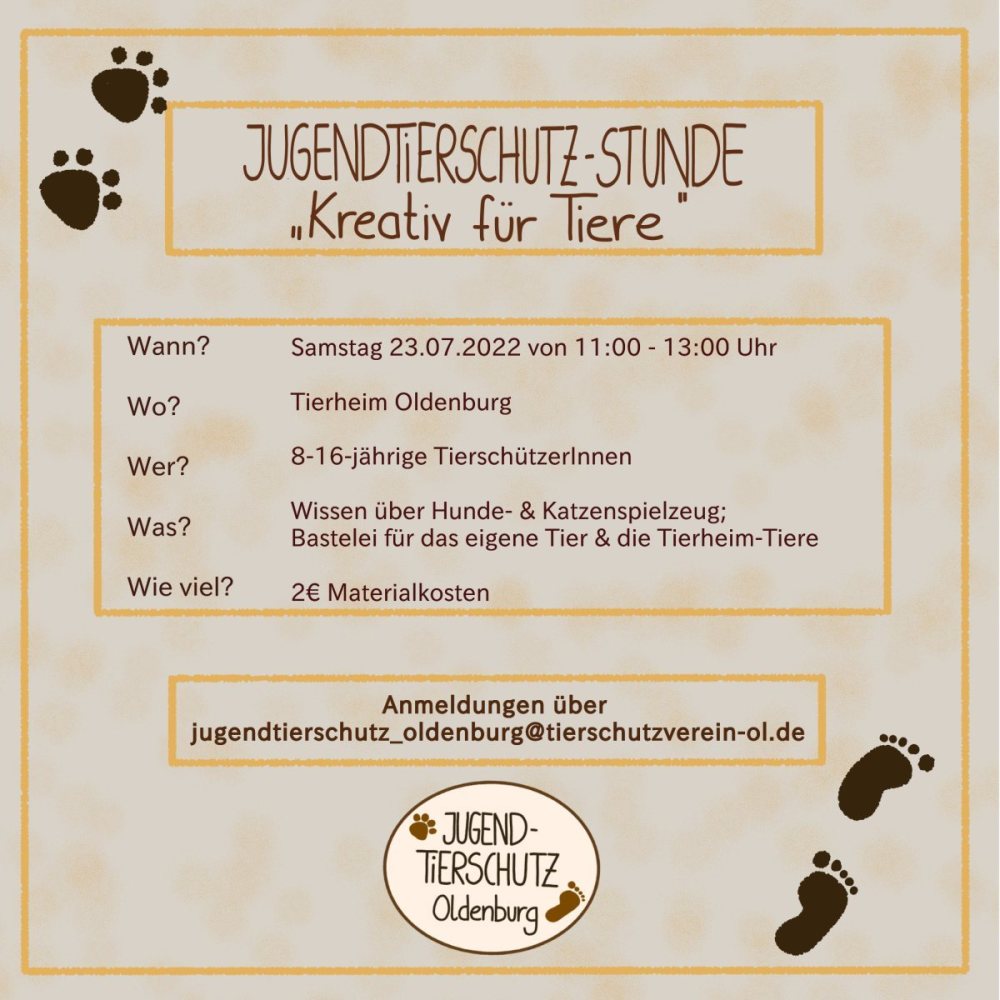 Die kommende Jugendtierschutz-Stunde erfordert eure Handarbeitskunst und trägt den Titel „Kreativ für Tiere“ wir werden etwas über Tier-Spielzeuge erfahren und eigene Spielzeuge basteln, die euren Tieren und den Heimtieren eine Freude bereiten. Alle Informationen sind auf dem Flyer, im Bereich „Jugendtierschutz“ auf den Webseiten des Tierschutzvereins und des Tierheims Oldenburg sowie unserem Instagramaccount „jugendtierschutz_oldenburg„. […]