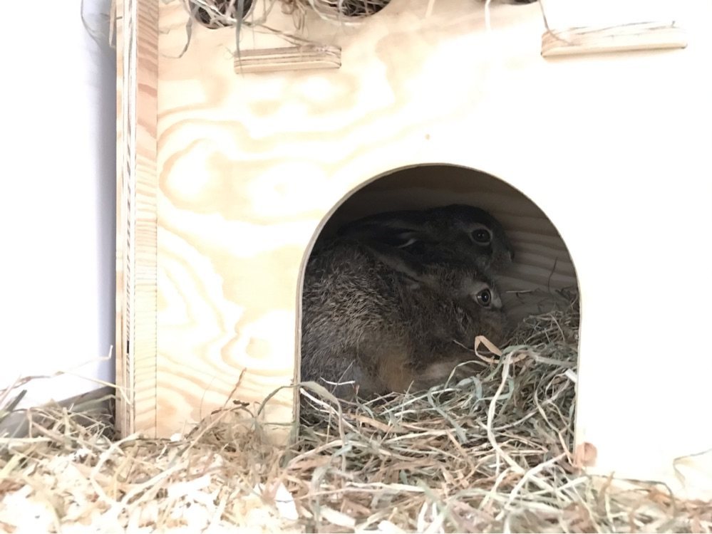 Die beiden kleinen Hasen, die gefunden und eingesammelt wurden, entwickeln sich prächtig. Azubi Sahra kümmert sich, päppelt mit Aufzuchtmilch und seit Kurzem mümmeln die Zwei sogar schon Heu!