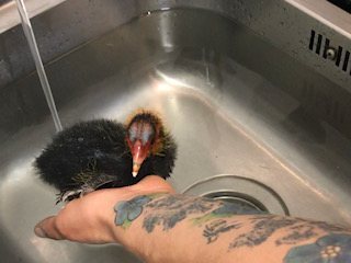 Unser Blässhuhnküken Ingo hat verkümmerte Beinchen. Damit diese schöne Muskeln aufbauen – muss er nun täglich schwimmen üben. In der Spüle des Kleintierhauses kann er ganz hervorragend seine Runden drehen :)