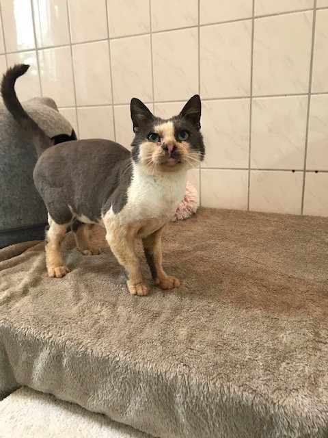 Schmuddelkater Schmuddelbuddel wurde das Fell abgeschoren. Da er sich ständig übermäßig putzt und sein Fell herauszupft, hat sich der Tierarzt entschieden, das Fell zu scheren und eine Hautstanze zu nehmen, um zu schauen, was in seiner Haut vor sich geht. Wir hoffen, dass Schmudel bald kein Schmuddel mehr ist und sein Fell wundeschön nachwächst!
