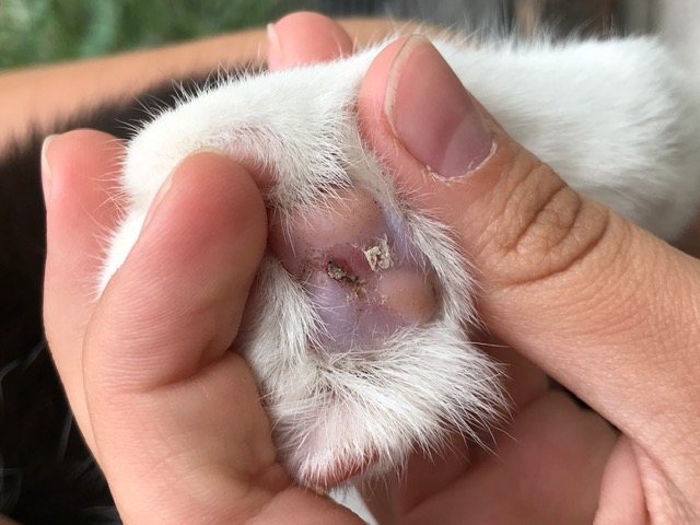 Ob Katze Mimi noch in ihrem alten Zuhause oder bei uns in der Gruppe gebissen wurde, ist unklar. Sicher ist jedoch, dass ihr der gemeine Angriff auf die Pfote bestimmt tüchtig weh getan hat! Ein bisschen Wundspray und ein paar Streicheleinheiten werden das Problem aber sicher schon bald lösen!