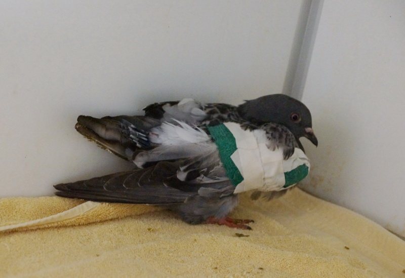 Taube Herr von Bremen hat sich bei einem Flugunfall den Flügel gebrochen. Ihm wurde ein Verband angelegt und Schmerzmittel verschrieben. Jetzt heißt es Boxenruhe, damit alles wieder zusammenwächst und er sich hoffentlich bald wieder in die Lüfte schwingen kann.