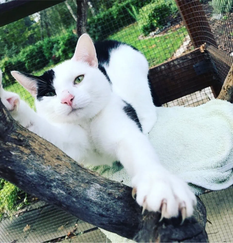 Kater Jack hat eine Zungennekrose, weshalb er aus der Gruppe in eine Quarantänestation gesetzt wird. Seine Zunge ist so kaputt, dass er sabbert und nicht richtig gern fressen mag. Mit Schmerzmittel und Antibiose sollte das aber schnell wieder ganz anders aussehen und Jack im Nu wieder gesund sein. :-)