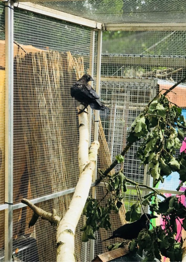 Weil mittlerweile drei junge Krähen im Tierheim aufgezogen werden, wurde ihnen eine eigene, große Voliere gebaut. Dort können sie von Ast zu Ast fliegen, in einer Hütte mit Stroh schlafen, in einer Wanne baden und bekommen jeden Tag eine köstliche Futterpampe von Tierpfleger Toivo gematscht. ;-). Wenn sie alt genug sind, dürfen sie davonfliegen.