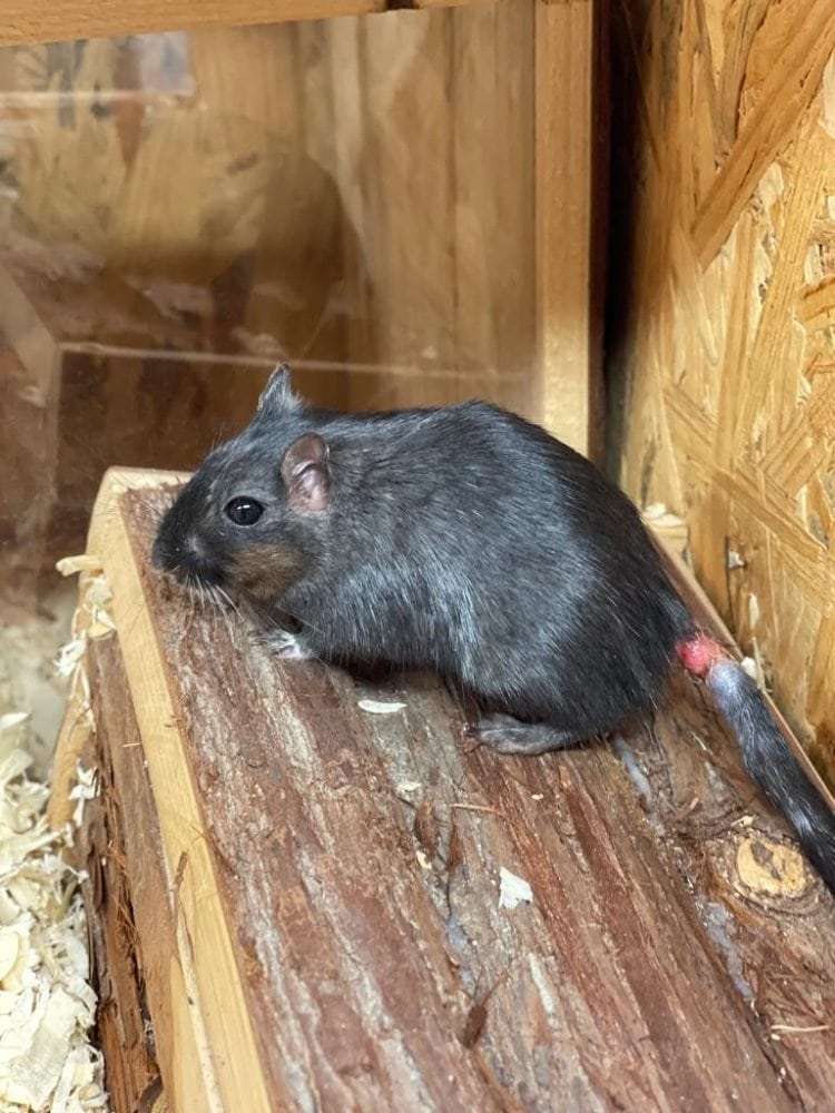 Kalahari ist ein kleines Wüstenrennmaus Mädchen. Sie hat angefangen, sich ihren Schwanz an der Wurzel kaputt zumachen. Der Tierarzt vermutet das die Ursache ein Ringtail ist, zusätzlich dazu haben sich auf die Wunde Bakterien gesetzt. Dafür bekommt sie jetzt jeden Tag Antibiotika und Schmerzmittel.