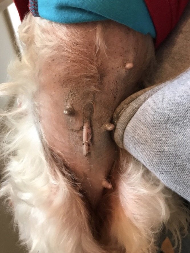 Havaneserhündin Trixi hatte einen Tierarzttermin. Ihre Zähne wurden saniert, es wurde Blut für ein Blutbild und einen Allergietest genommen und eine kleine Umfangsvermehrung am Bauch wurde entfernt. Damit die kleine Nase nicht an ihrer Wunde knabbern kann, trägt sie einen schicken roten Body. :-)