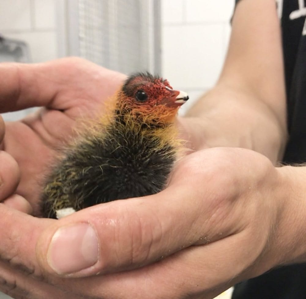 Beim Angeln wurde unser kleiner Ingo von einem Herrn aufgelesen. Nirgendwo waren Elterntiere oder Geschwister in Sicht und so entschied sich der Angler, Ingo zu uns zu bringen. Auch wenn Ingo rein farblich gesehen eher wie ein Papagei aussieht, so ist und bleibt er ein Blässhuhn.