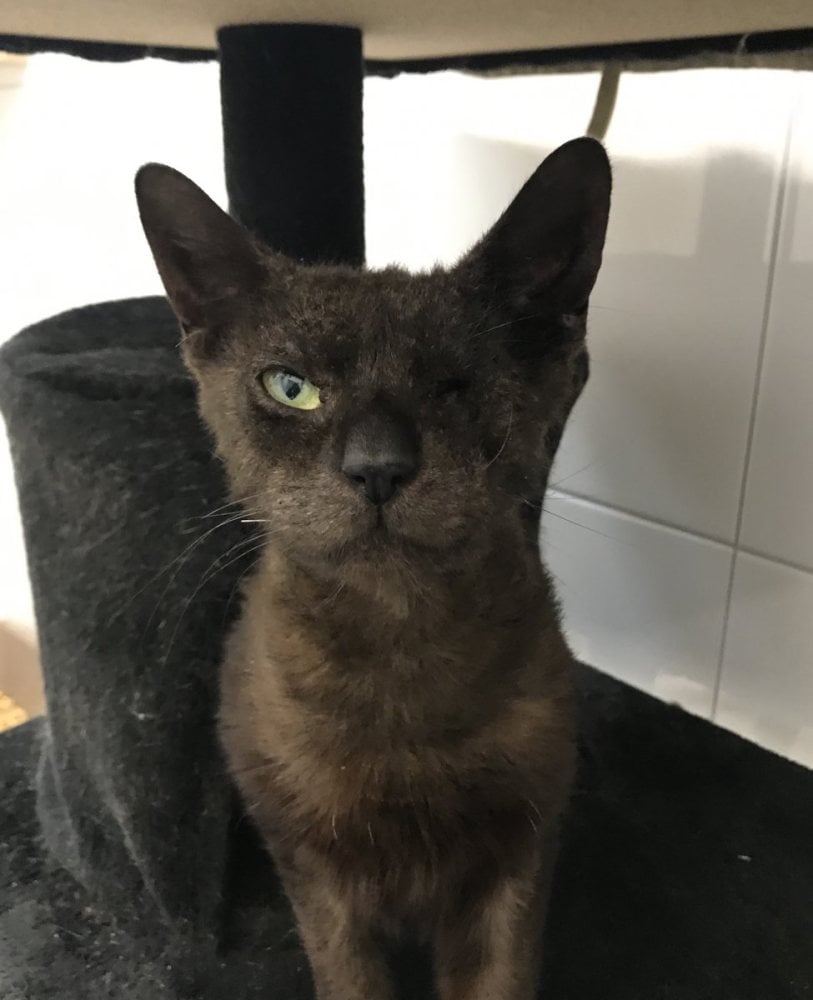Kater Leonard kam in einem sehr schlechten Zustand zu uns. Er ist nicht bloß einäugig, seine Haut ist bis zum Hals ganz krustig und stellenweise blutig. Der Tierarzt vermutet eine Allergie oder eine parasitäre Problematik und hat ein Gewebeprobe ins Labor geschickt. Wir hoffen sehr, dass das Ergebnis Aufschluss bringt und wir Leonard schnell helfen können. Bis dahin bekommt er hypoallergenes Futter und Medikamente, die seinen Juckreiz lindern.