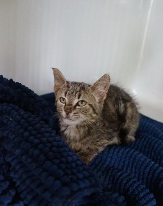 Kätzchen Mausi sitzt mit einer Pilzinfektion in der Quarantäne. Sie hat kahle Stellen auf der Nase und am Schwanz, die einmal am Tag mit einer speziellen Lösung eingecremt werden, und bekommt zusätzlich Medikamente unters Futter gemischt. Mit großem Appetit futtert sie alles brav auf und wird bestimmt schnell wieder gesund!