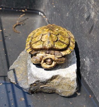 Mississippi-Höckerschildkröte Maxi hat wahrscheinlich nekrotische Veränderungen am Bauch- und Rückenpanzer und zum Teil auch am Hals. Die Kröte wurde erstmal aus dem Sommerteich gefischt und von den anderen Schildkröten separiert, bis sie einen Termin bei der Reptilienspezialisten hat. Wir hoffen, dass wir Maxi helfen können.