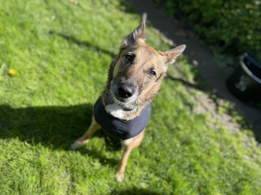 Die OP hat Mira gut überstanden. Jetzt muss sie einen Body sowie Trichter tragen, damit sie nicht an die recht lange Wundnaht kommt. Außerdem bekommt sie Schmerzmittel und Antibiotikum und wir hoffen, dass die Wunde gut verheilt und Mira bald wieder zur den Auslauf tollen kann.