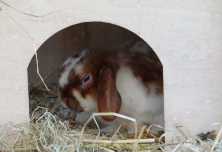 Kaninchen Archibald hat eine alten Augenverletzung, wegen der sein Auge ständig läuft und tränt. Damit es ihm schnell besser geht, bekommt er täglich Augentropfen.