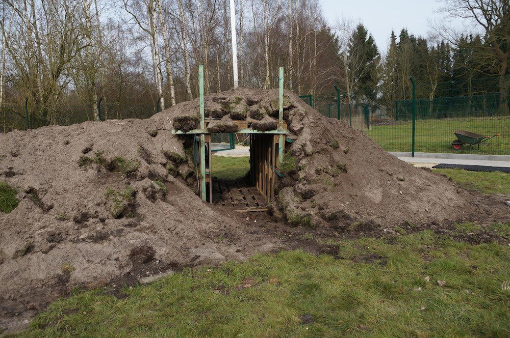Die ganze Erde aus den neu gepflasterten Flächen wird zusammen geschüttet und ein Tunnel wird aus den Paletten gezimmert…. Das wird toll!