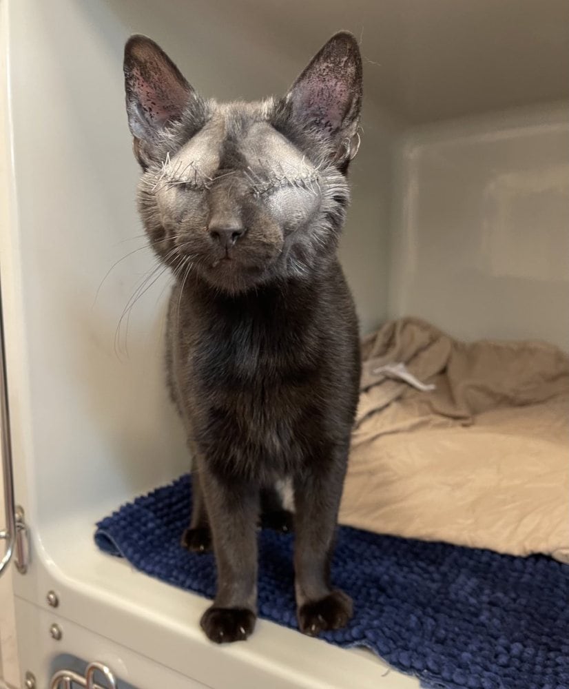 Gestern haben wir einen jungen Kater bekommen, dessen Augen beide so schlimm entzündet und vorgetreten waren, dass er sofort zum Tierarzt gebracht wurde. Dort wurden in einer Not-OP beide Augen entfernt, da sie nicht mehr zu retten waren. Dem kleinen Nico geht es heute prächtig, er hat die OP gut überstanden und fordert fröhlich Streicheleinheiten ein. So ein lieber Kerl!