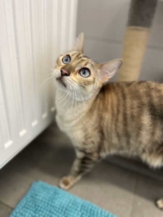 Nidalee ist eine Abgabekatze und hat in ihrem früheren zu Hause hin und wieder mal nicht in die Toiletten gepinkelt. Das war für uns der Anlass ihre Blase mal checken zu lassen, denn wenn Katzen nicht Stubenrein sind, ist es oft ein Zeichen, dass medizinisch etwas nicht stimmt. Nach dem Tierarztbesuch wussten wir dann, Nidalee hat eine Stressblase. Das heißt, wenn Nidalee durch Umzug oder Umstellungen in ihrem häuslichen Umfeld Stress hat, neigt sie zu einer Blasenentzündung. Leider kann man ihr dann auch bis auf Schmerzmittel geben, nicht weiter helfen. Jetzt versuchen wir ihren Stresslevel so niedrig wie möglich zu halten und suchen für sie und ihren neuen besten Freund Felix ein neues Zuhause.