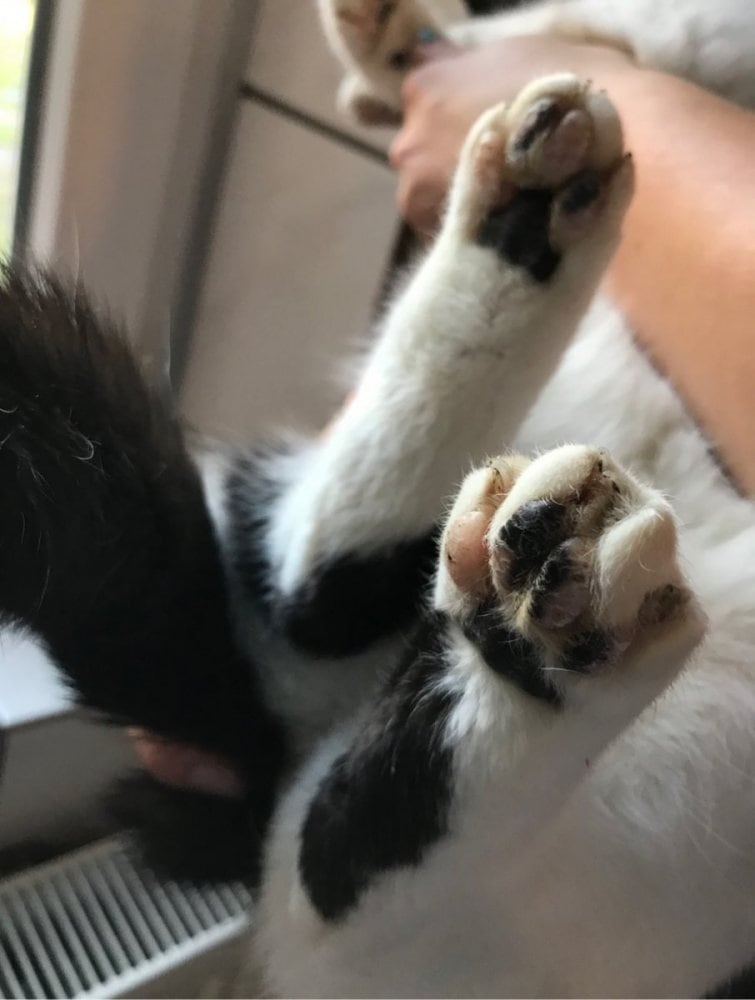 Katze Peanut hat eine seltene Krankheit, die bei Katzen vorkommen kann. Dabei werden die Ballen außen rau und gleichzeitig sehr weich und übermäßig elastisch. Mit einem Antibiotikum ist das zwar behandelbar, tut aber natürlich trotzdem weh, sodass Peanut am liebsten den ganzen Tag herumliegt und sich nicht bewegt.