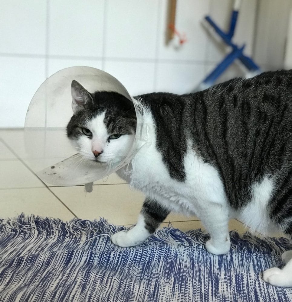 Peter Pöschel ist nun soweit: er darf wieder in die Gruppe im Katzenhaus ziehen. Sein Krankenstationsaufenthalt ist vorbei. Wir hoffen sehr, dass er aufhört, an seinen Wunden zu schlecken – so ganz vertrauen wir ihm noch nicht, darum muss der Trichter noch draufbleiben. Aber an den hat er sich mittlerweile so gut gewöhnt, dass er damit auch klettern kann!