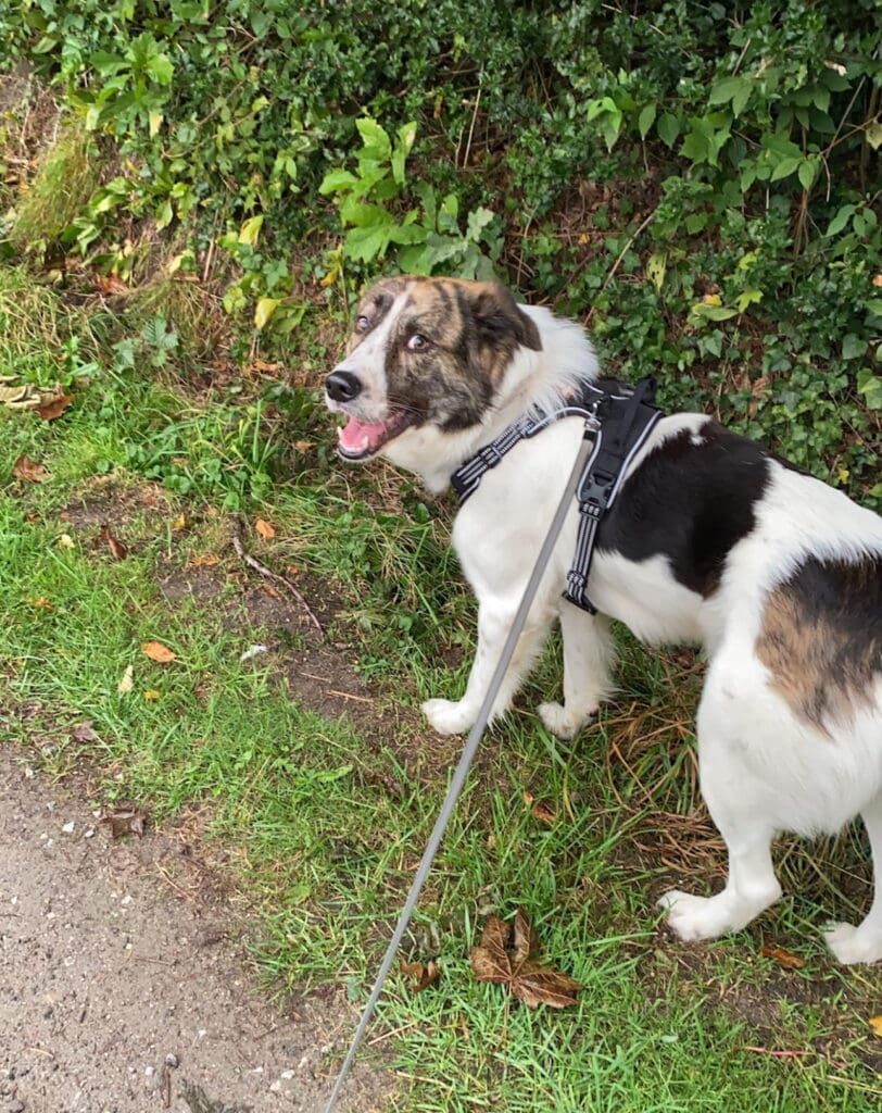 Er läuft ordentlich an der Leine. Mit Hündinnen ist er meist verträglich, Rüden und kleineren Hunden gegenüber eher nicht.